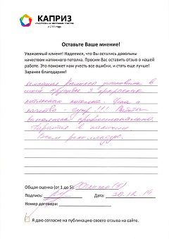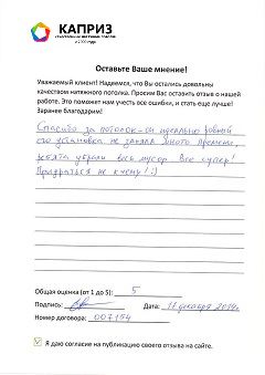 Качество – cупер. Гарантия – в наличии. Компания «КАПРИЗ» установила в моей хрущевке 3 прекрасных натяжных потолка. Цена и качество -супер! Работа выполнена профессионально. Гарантия в наличии. Всем рекомендую. Алина, г. ИССЫК